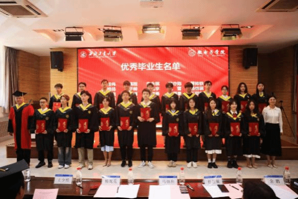 学院党委副书记余鹏宣读学校《关于表彰2025届本科生“优秀毕业生”的决定》。院长马炳和、党委书记杨妮花为优秀毕业生颁发荣誉证书并佩戴纪念胸牌,勉励他们在未来道路上砥砺前行,再创佳绩。