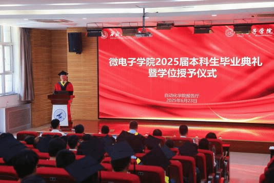在庄重的学位授予仪式环节,毕业生们身着学位服依次登台。院长马炳和教授、副院长王少熙教授、阴玥副教授为他们逐一拨穗正冠、授予学位证书。流苏从右至左的拨动,标志着2025届微电子学子学业功成,正式启航新征程。