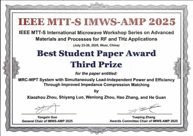 2025年7月23至26日,江苏省产业技术研究院和香港城市大学青岛研究院主办的国际微波系列研讨会(IEEE MTT-S International Microwave Workshop Series on Advanced Materials and Processes for RF and THz Applications)在江苏省无锡市成功召开。经过评审,会议最终评选出来自悉尼大学、上海交通大学、东南大学、电子科技大学和西北工业大学的6篇会议论文当选最佳学生论文奖,其中一等奖1名、二等奖2名、三等奖3名,太阳城网络赌博平台-太阳城赌博